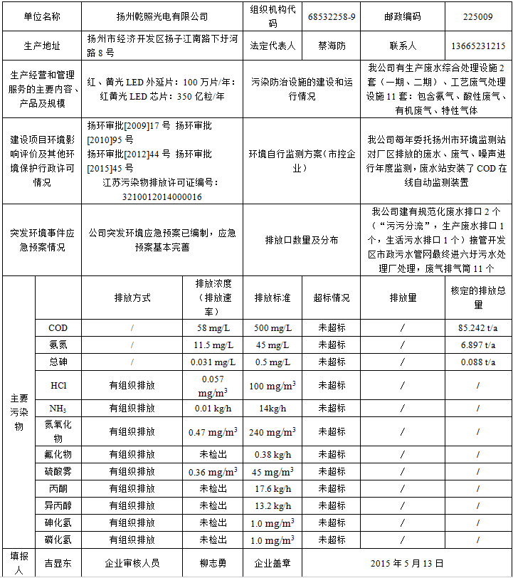 揚州乾照光電有限公司環境信息表