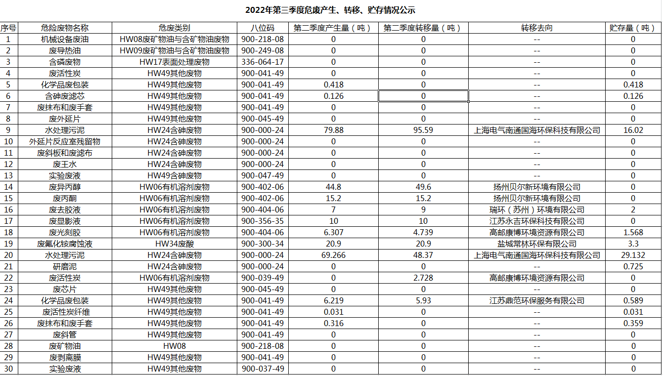 揚州乾照光電有限公司2022年第三季度危廢產生、轉移、貯存情況公示
